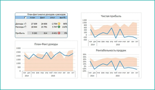 Модель ускорит работу, собрав на одном листе Excel все полезные таблицы, диаграммы и графики. Данные связаны с базой, в которой собираются плановые и фактические доходы и расходы, поэтому информация всегда актуальна.